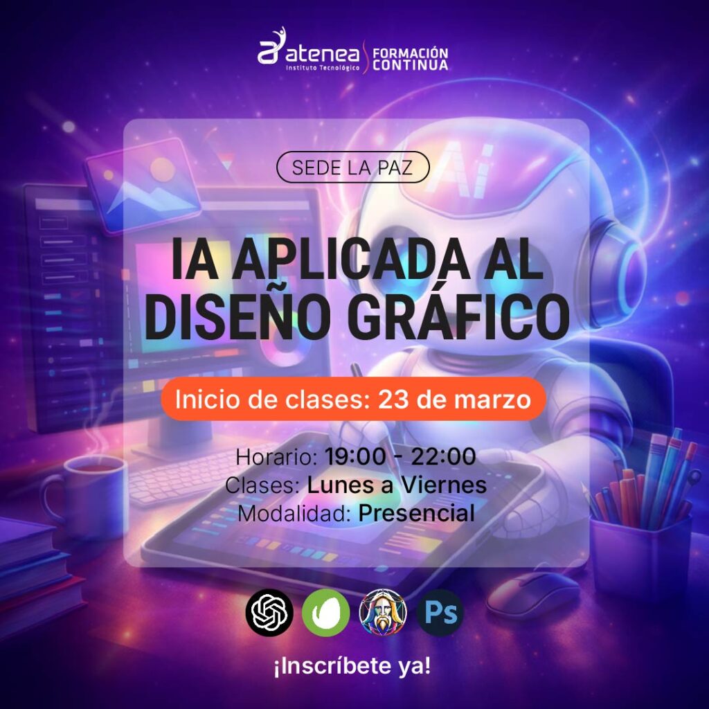 🚀 Aprende a integrar la IA en tu proceso creativo para optimizar tiempos, generar ideas potentes y crear piezas visuales de alto impacto.✨💻 CURSO PRESENCIAL - SEDE LA PAZ 🌐